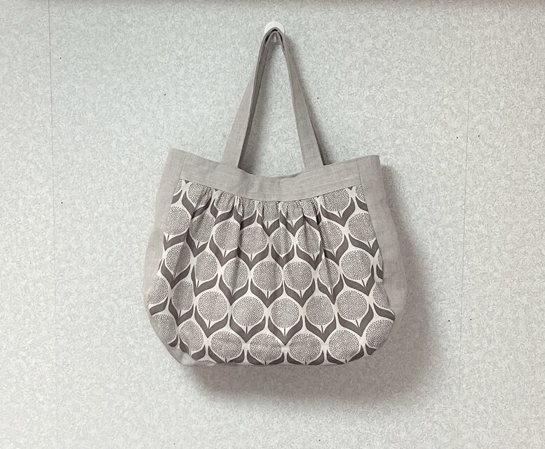 前後正面の真ん中にギャザーを寄せ、ふんわりとした表情に仕上げたバッグです。内側にはポケットをひとつつけています。入れ口とマチの部分に芯地を使用し、丸いシルエットが保持するようにしています。入れ口部分には簡単に開閉できるマグネットボタンをつけています。