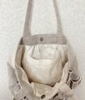 入れ口やマチ部分や持ち手など、スレや汚れの目立ちやすい部分には無地のリネン生地を使用しました。いずれも厚手で丈夫なので、デイリー使いにピッタリです。