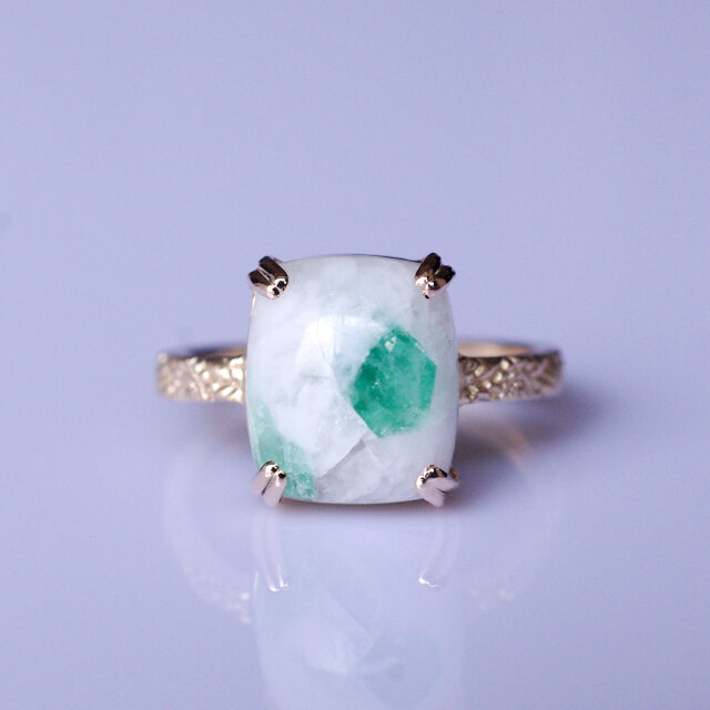 エメラルドの結晶がマトリックス(白い母岩)の中に入り込んでいる、アートピースのようなルース。