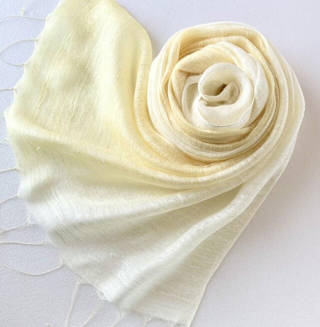 優しい淡いイエローの濃淡の柔らかな女性らしい印象のストールです。お顔周りが華やぎます。
