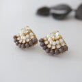 やわらかな光と落ち着いた色が調和した、上品にきらめく扇形のビーズ刺繍のピアス。