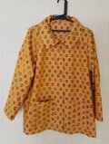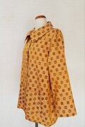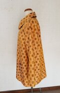 光沢のある少しベージュがかったオレンジの地色に、カーキ色で模様が描かれている銘仙着物(絹)から作りました。