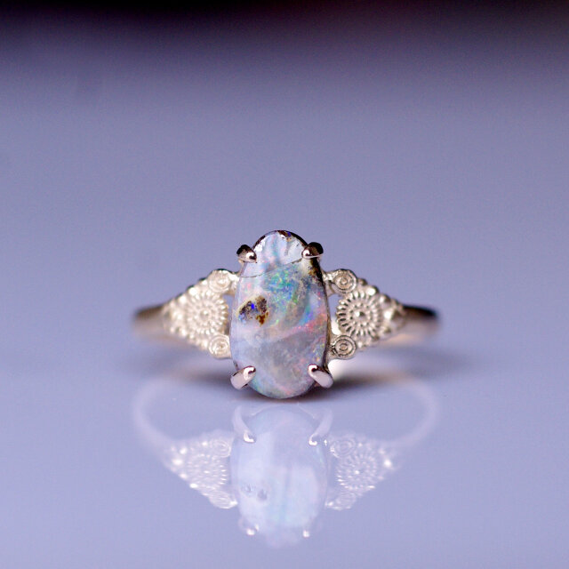 オパール部分の遊色はレッド、グリーン、ブルーなど、さまざまなニュアンスを楽しめます。