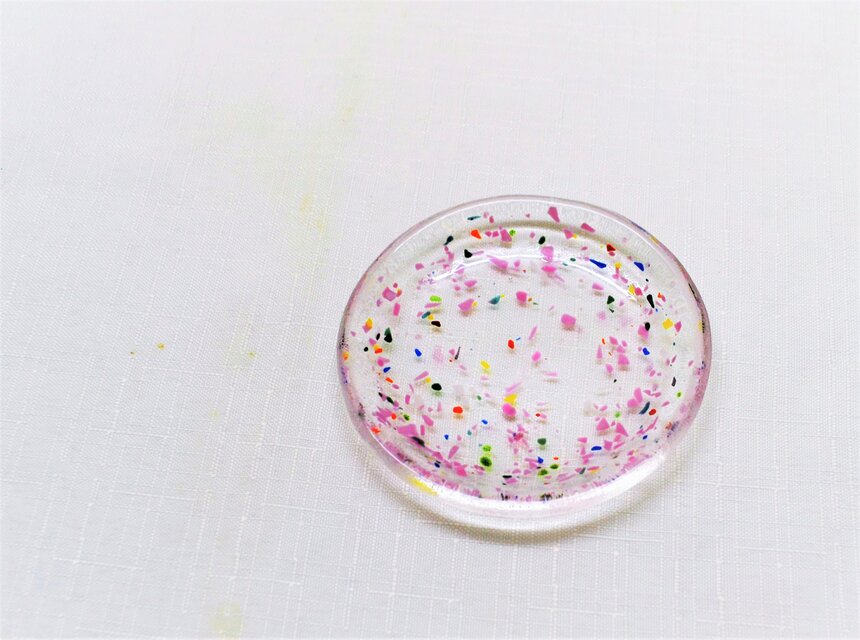 紙の様に薄いピンクのガラスと、グリーン、ブルー、イエローのガラスを小さく