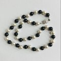 こちらはガラス素材の原玉に、オリジナルパール塗料にて何層にも渡り重ね塗りを施した日本製ガラスパールになります。パールの間1つづつ丁寧に結び目を入れたオールノットタイプのネックレスになっております。カラーはホワイトパールとブラックのコンビ。パールサイズは定番の約8mm玉で、長さは標準的なプリンセスサイズのやや長めの全長約45cm。クラスプには、クラシカルなデザインの差し込みタイプを使用。