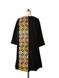反物幅の織物生地を縦半分にカットし前後身頃の中心から繋ぎ合わせて縦ラインが活きるようにしました。