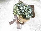 アンティークカラーに染まったブルーグラデーションのアジサイと優しいオフホワイトの小花とスターチスにラベンダーを束ねました。