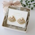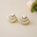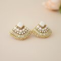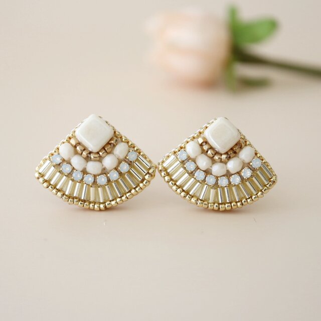 クリスタルを使用した、大人可愛い扇型のビーズ刺繍ピアス。放射状に刺繍した竹ビーズが、光の加減でさりげなくキラキラします。