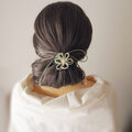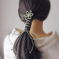 まず最初にゴム部分で髪をまとめ、垂れている紐部分をそのゴム部分の上から巻きつけて使用することにより「和」な雰囲気のまとめ髪を楽しもうと言う趣向で作りました