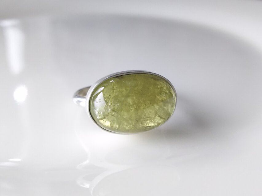 落ち着いた鶯色がキラキラ輝く、大粒グリーンガーネット(ツァボライト)のリングです。