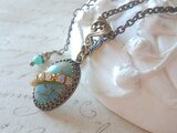 アジャスター先にも少しGreenがかったターコイズ色のJapanヴィンテージGlassビーズ、ラインストーン入りロンデルを用い、トップのデザインとリンクさせました。