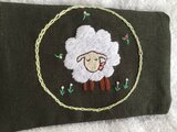 濃いめオリーブグリーンのコットンリネン布地に羊と小花をデザイン・刺繍した通帳ケースです。
