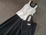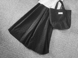 スカートは下からスポッと履くウエストゴムのデザインで、前面に大きなボックスプリーツ、後ろから見るとAラインのギャザースカートです。