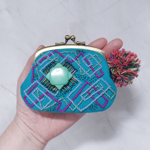 ふたこぶビーズ刺繍の眼鏡ケースがま口 Islandありがとうございました。発注後に制作して頂いた作品もありましたのに、3点共に緻密ビーズワークで驚きました。それでいて色もデザインも自由!!素敵です。一つ一つに見とれてしまいます。迅速な対応、素敵なラッピングと梱包、すべてが「月によろしく」さんなのですね。素敵な出会いに感謝です。