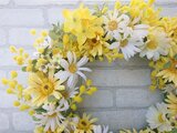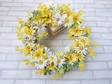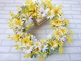 黄色と白のマーガレットにミモザを組み合わせた可愛い雰囲気のリースです。ふんわり優しいイエローに癒されることまちがいなしです。