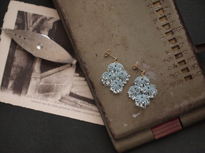 タティングレースと言う技法で結われたモチーフをピアスにしました。