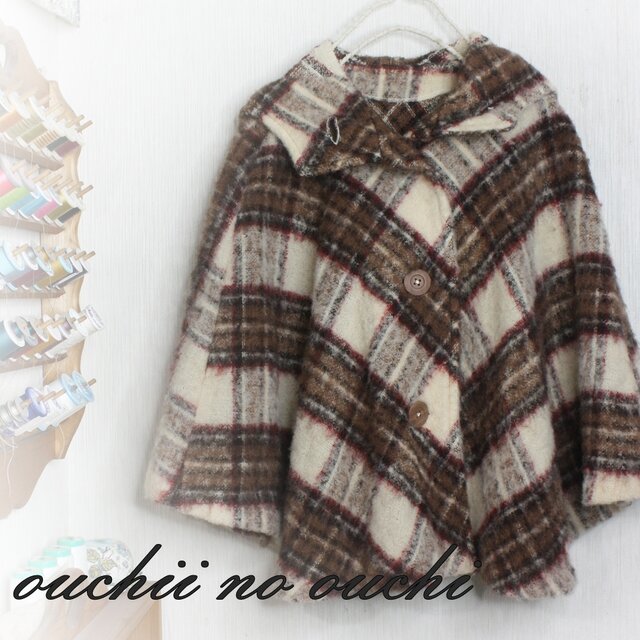 ブラウン系の毛羽立ちのある高級ウール生地でフード付きポンチョを製作しました。
