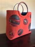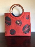 朱赤紬地の帯地に幾何学模様の帯地を嵌め込み、丸い木の手の手提げにしました。