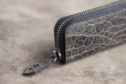 クロコ模様の型押しを施した後に、職人の手作業によって凹凸部分に加色することで、奥行きのある立体感を浮かび上がらせています。本物のクロコレザーの魅力をできるだけ再現。