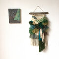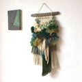 ディープグリーンやモスグリーン、ブルーグリーン等の様々なグリーン、スモーキーなブラウンやベージュ等のお色の素材を組み合わせ、、静かな森の中の沢山の木々や生き物、光をイメージしたタペストリーに仕上げました。