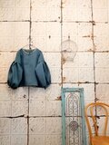 ブルーグリーンリネンとボタニカル柄のパフスリーブトップス
