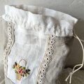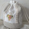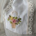 フラワーバスケットをリボン刺しゅうしたホワイトリネンを組合せた巾着です。