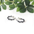 カットがキラリと輝く小粒のブラックスピネルをブラック色のポリエステルコードでジグザグに繋いだシックな雰囲気のピアスです。