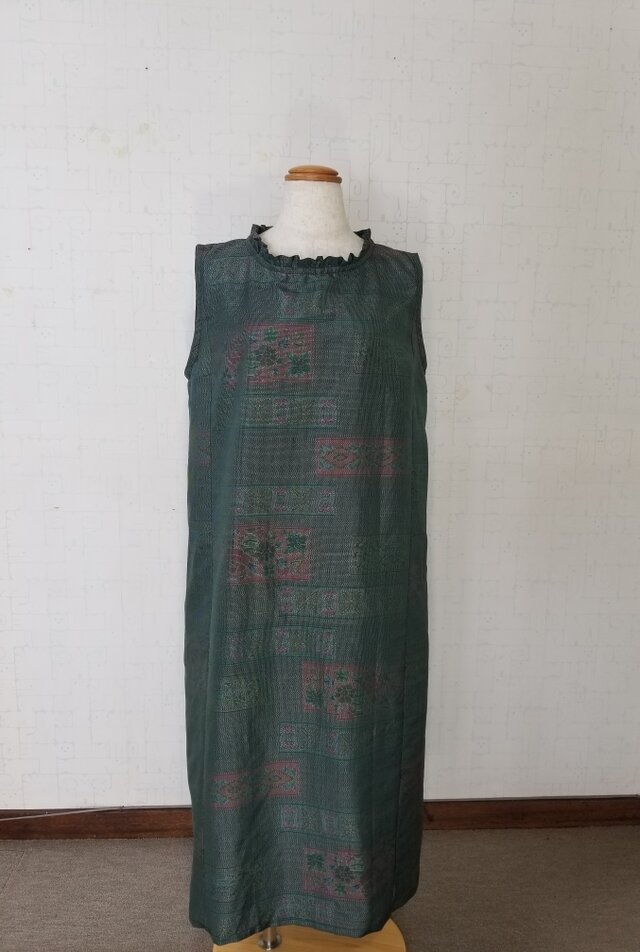 20%off 大島紬リメイク 襟ぐりギャザーワンピース