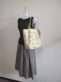 デニムのような少し硬いコットンに、ミモザのお花畑が広がるトートバッグです。