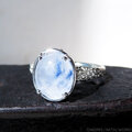 乳白色のクォーツにブルーの結晶が映える石を、透かし模様の台座にセットしました。