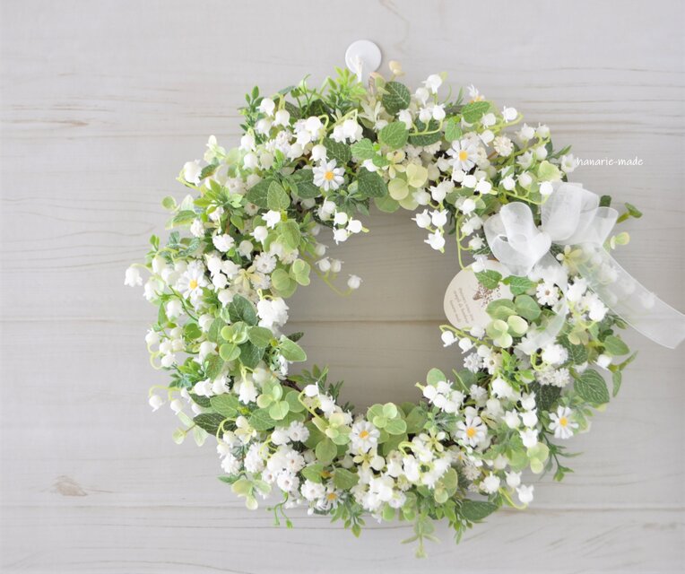 オーダーkoさま専用 あわゆき すずらんと小花のリース:すずらん カスミソウ デージー 白 ウェディング 春 夏 リボン