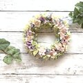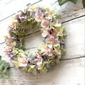 薄紅色の桜をメインにラベンダー・ホワイトカラーのアジサイと合わせた本当にほんのり桜色のリースです。