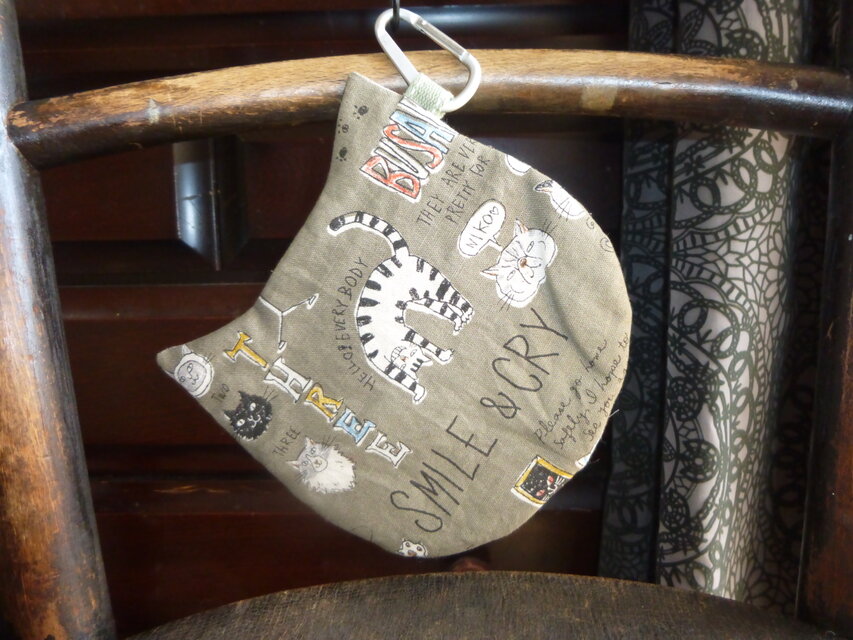 モスグリーン地に猫さんプリントのオックス地で作った猫型のポーチです。