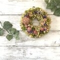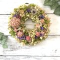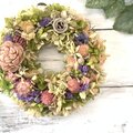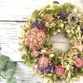 クラウドピンクのソーラーローズにグリーンカラーのアジサイを使ってシックな雰囲気に仕上げたリースです。