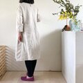パリッとハリのあるリネンのサイドギャザーワンピース。サイドに入れたギャザーのせいで、ふんわりしたイメージですが、スッキリシルエットです。薄くなく、厚すぎでもない、ライトフラックスカラー(薄いベージュかな)のナチュラルリネンです。