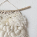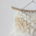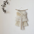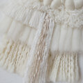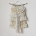 みるく色のふわふわクロスブレッドをたっぷり使用し、大粒リネンのネップヤーンやモヘアやチュール、ファンシーヤーン等と組み合わせ拘り織り上げた、優しく可愛らしいタペストリーです。
