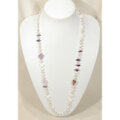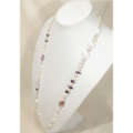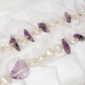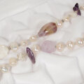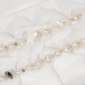 大粒のアメトリン、薔薇をモチーフにしたカットのアメシスト、光沢の美しい貝パーツ(マザーオブパール、白蝶)、照りの美しい本真珠(淡水パール)などのロングネックレスです。小粒のラブラドライトを天然石と本真珠の間に挟み、ネックレスの動きをスムーズにしています。