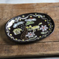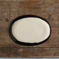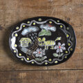 艶消しの黒釉の上に白釉を重ね(少し凹凸の厚みがあり)、その上から薄く彩色したトラさんの絵が描かれたオーバルプレートです。