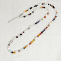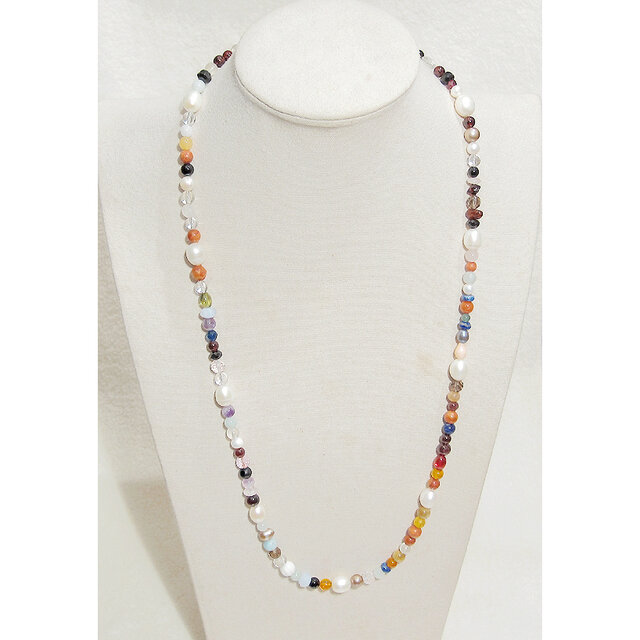 たくさんの天然石と本真珠(淡水)のロングネックレスです。天然石は、ガーネット、アメシスト、アクアマリン、水晶、ペリドット、ラピスラズリ、琥珀、オニキス、スモーキークォーツ、珊瑚、ローズクォーツなどを使っています。