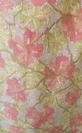 橙寄りのベージュの地色に、ピンク寄りの橙の花、抹茶よりの緑等で枝が描かれています。