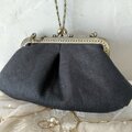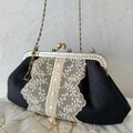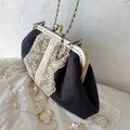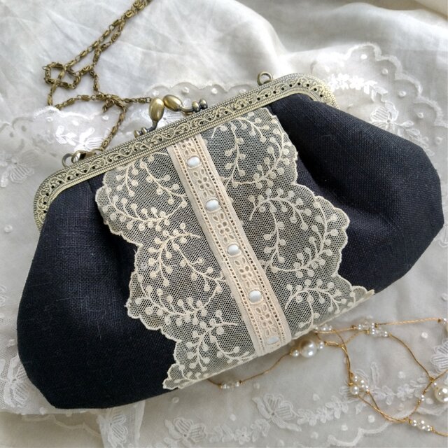 黒リネンにアンティークレースをのせたがま口バッグです