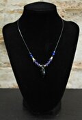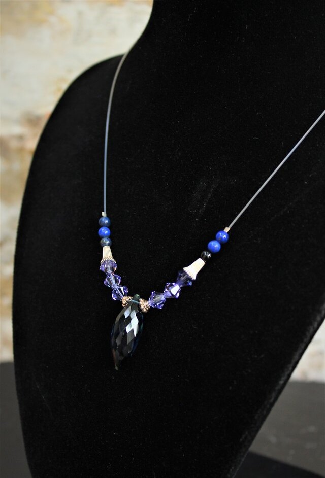 ダイヤ型の、美しいカッティングのカイヤナイトです。スワロフスキークリスタルと、4mmのソーダライトを組ませました。透明のテグスのワイヤーでチョーカー風に仕上げました。