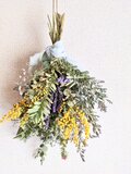 無農薬のハーブ畑で育てたギンヨウアカシア(ミモザ)とラベンダー、ユーカリとカスミソウを束ねた、カジュアルで春らしい軽やかなスワッグです。