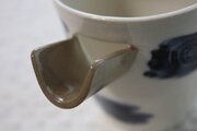 白土に赤土の注ぎ口をつけた酒器です。流れる呉須模様の上に渦巻きをのせました。