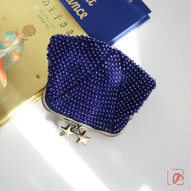 濃いブルーで揃えたビーズと糸に星のつまみをあわせて、夜空の星を表現しました。
