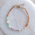 小粒の天然石、ヘソナイト、フォスフォシデライト、アマゾナイトマザーオブパールをバランスよく一粒一粒丁寧に繋いだビーズブレスレット。