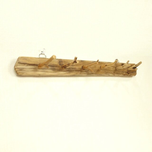6本の飛び出るフックは枝流木を使用、それぞれの枝分かれがかわいく、茶色い木の皮も見られます。