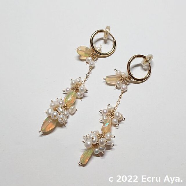 ピアスパーツには、一粒のオパールと淡水パール4個を下げました。