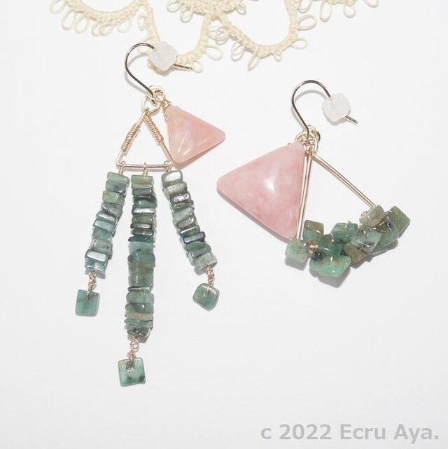 小さなピンクオパールの方は、ワイヤーで小さな三角をお作りし、エメラルドのスクエアを繋いだパールを3個下げました。