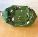 グリーンの地にハリネズミ、内側はテラコッタカラー。かぼちゃみたいな色合わせです(ワニのようでもあり)。